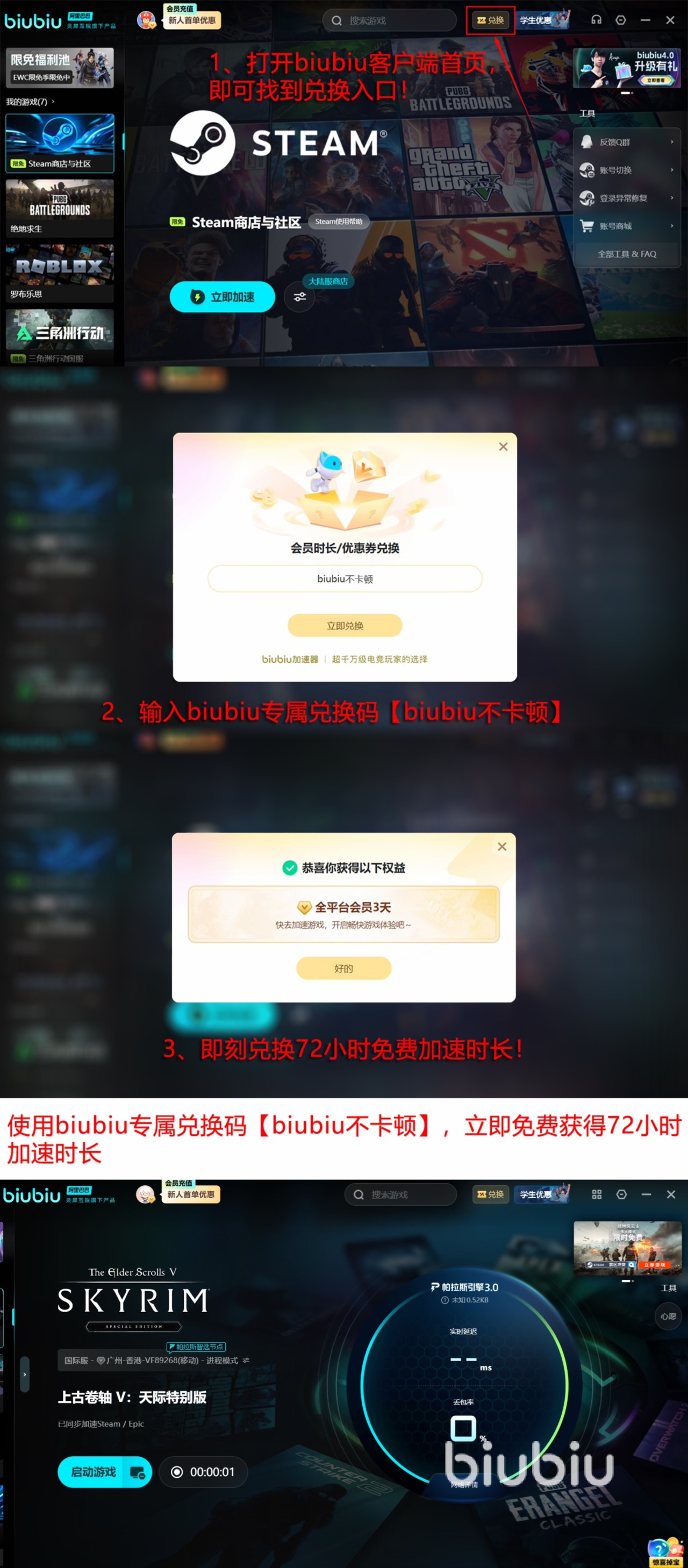 当然,除了多个游戏平台加速免费外,它因为新人推出了免费的福利政策,新用户注册立享24小时加速时间,还有【biubiu不卡顿】兑换码领取的3天加速时长,新老用户都能用它领到3天免费时间。新朋友等于可以免费获得长达96个小时的体验时间,效果一览无遗地展现在大家面前。