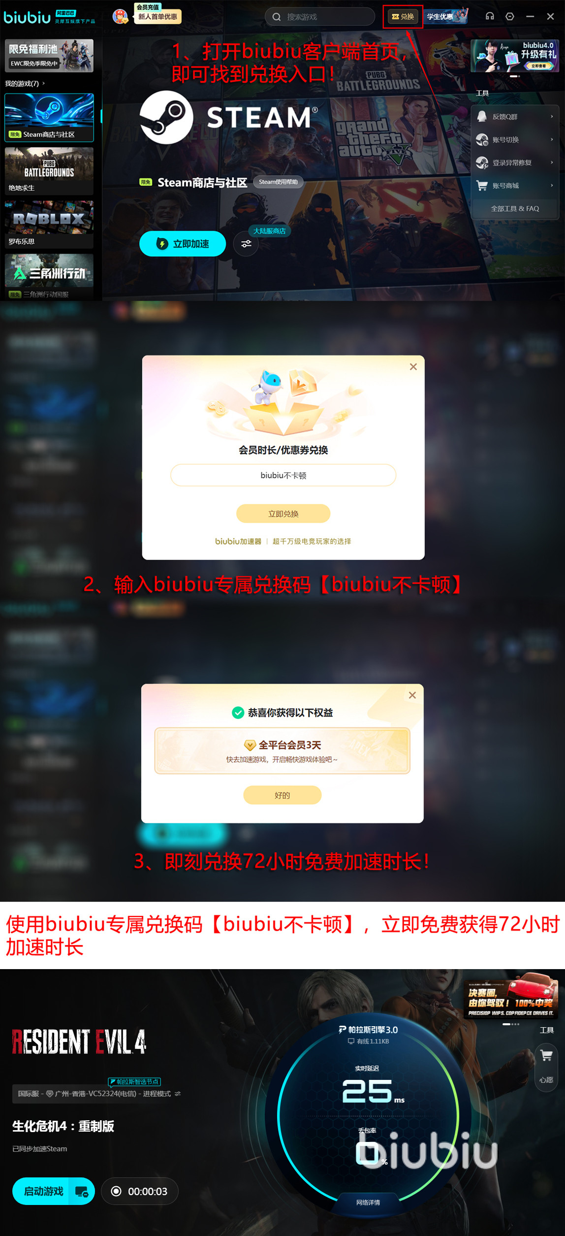 biubiu加速器为了广大新用户放心使用,现在推出了免费使用一天的福利活动,新用户现在注册会员就能领取一天的免费加速游戏时间。同时为了回馈新老用户长期以来支持,在搜索框输入,兑换码【biubiu不卡顿】,就能享受3日的免费加速时长。