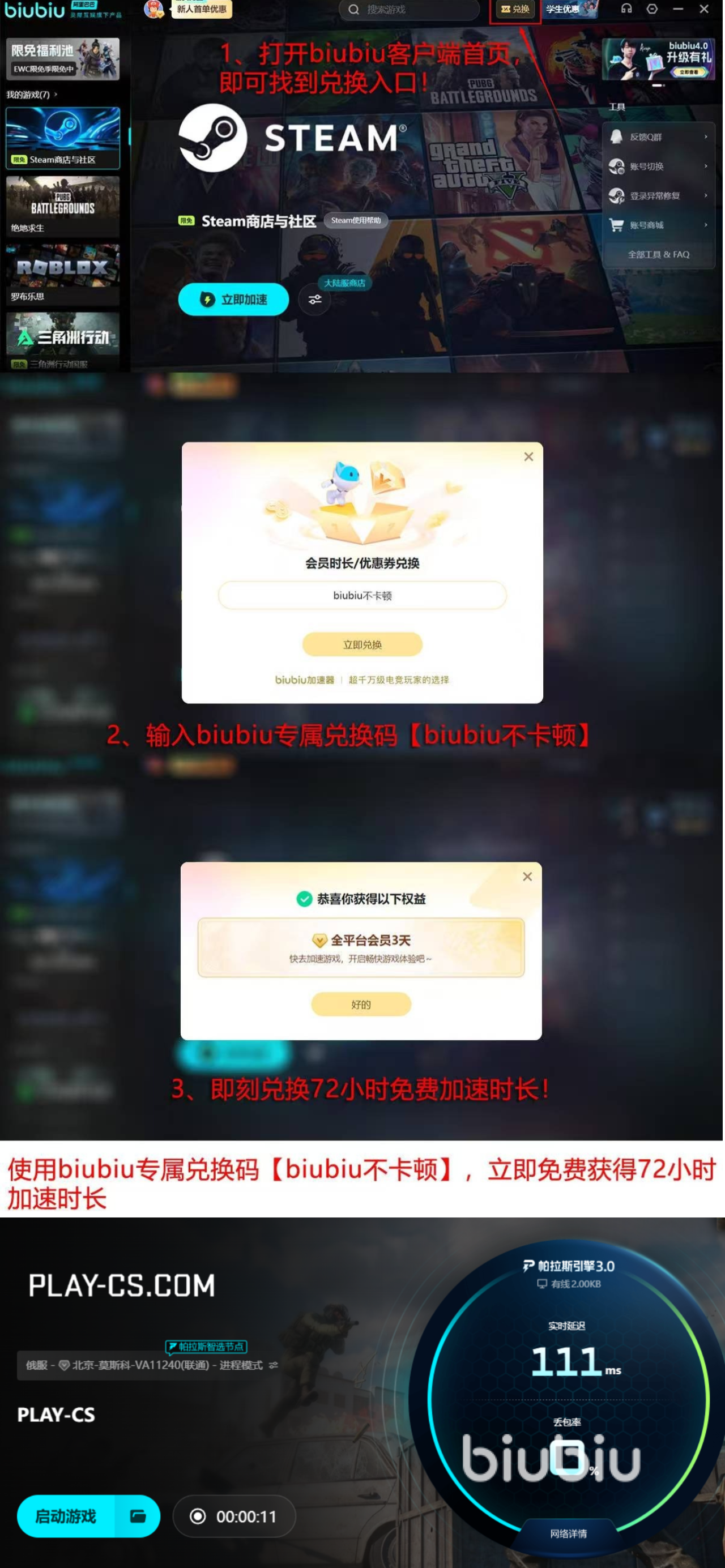有的用户之前没有用过该应用也没关系,平台给大家提供了不少的福利,比如新人注册有24小时体验的时间,平台自动发放,无需用户自己领取,同时还给所有人提供三天体验时长,这个福利是小伙伴们自己领取的,可以根据个人休息时间安排。大家只需要在规定好的兑换区域内使用【biubiu不卡顿】就可以顺利拿到手。