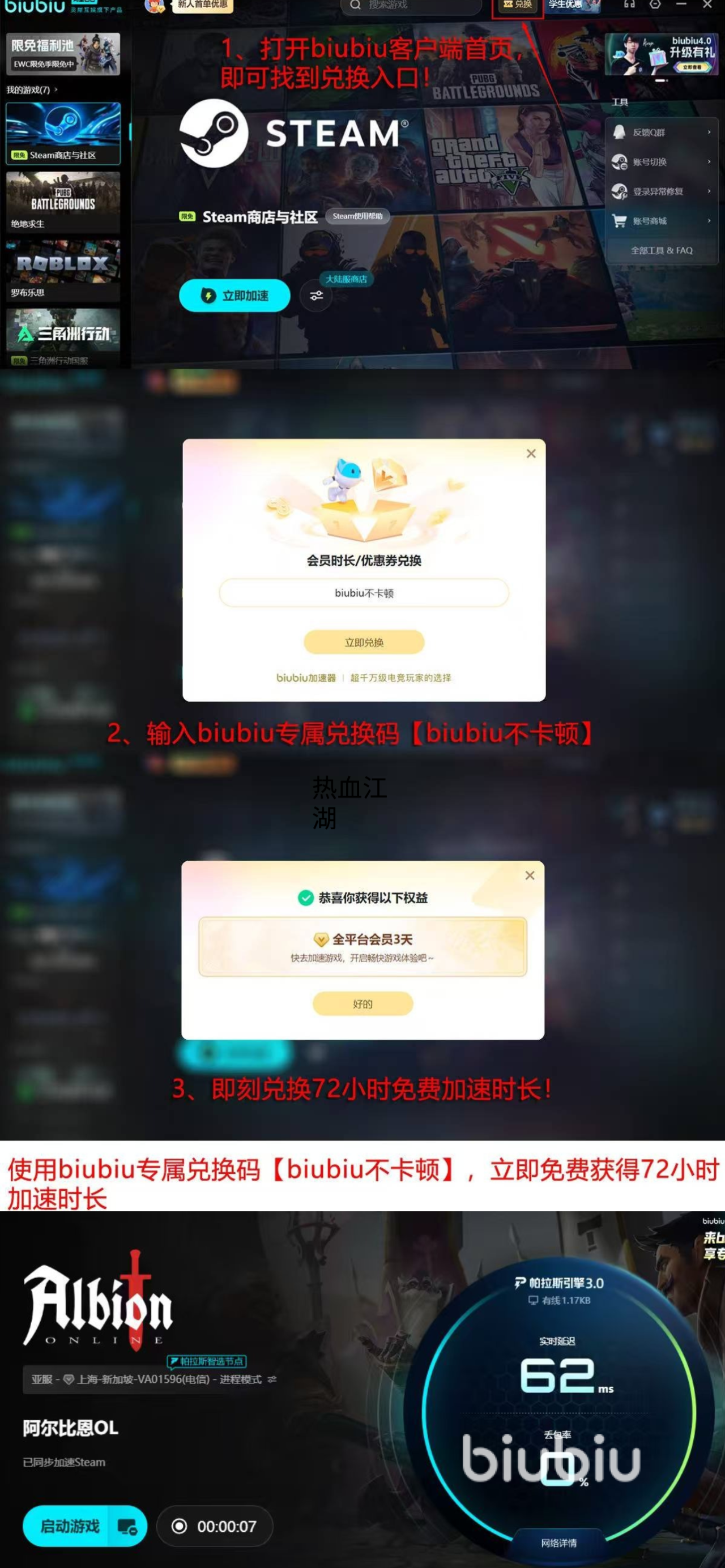 或许有的小伙伴还抱有怀疑态度,那么不妨亲自下载尝试体验一番,平台给大家提供了很多的福利,不需要花钱就可以免费提速,新人在第一次注册时,就可以得到平台赠送的24小时福利了,同时所有人还可以参加口令服务,在指定的区域内使用【biubiu不卡顿】就可以顺利拿到手三天的体验时长,新人可叠加享受四天提速时间。