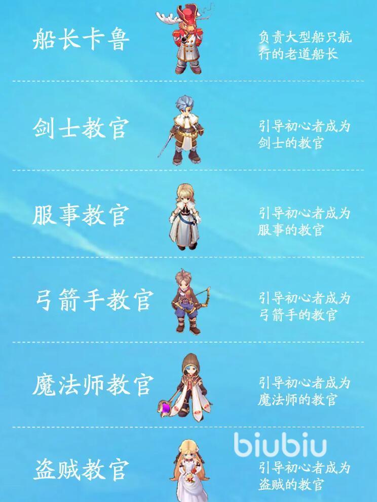 职业成长体系由五类教官NPC支撑:剑士教官、服侍教官、弓箭手教官、魔法师教官与盗贼教官,分别对应五大基础职业路径,提供技能学习、转职条件说明及进阶指引。另有一位标志性NPC——老道船长卡鲁,掌管大型船只航行系统,是跨地图移动、副本进入及特殊事件触发的核心交互对象。