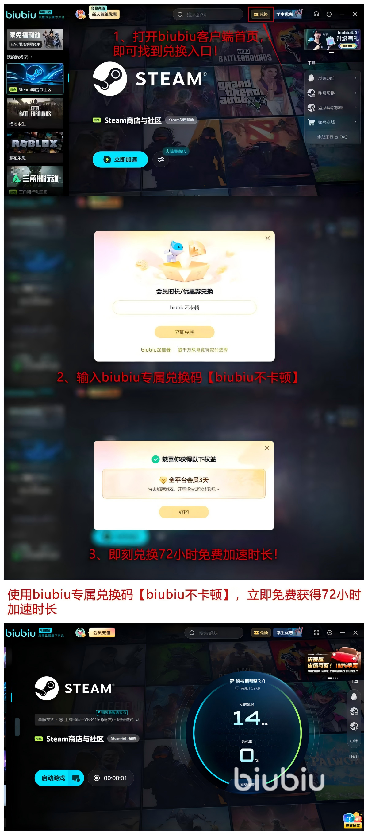 【biubiu不卡顿】口令对于玩家来说异常的重要,免费获取72小时加速时间,新用户能自动获取24小时的加速时间,合计免费时间96小时,对于很多玩家来说都是非常有用的免费体验时间,对这个感兴趣的玩家可以稍微了解一下。