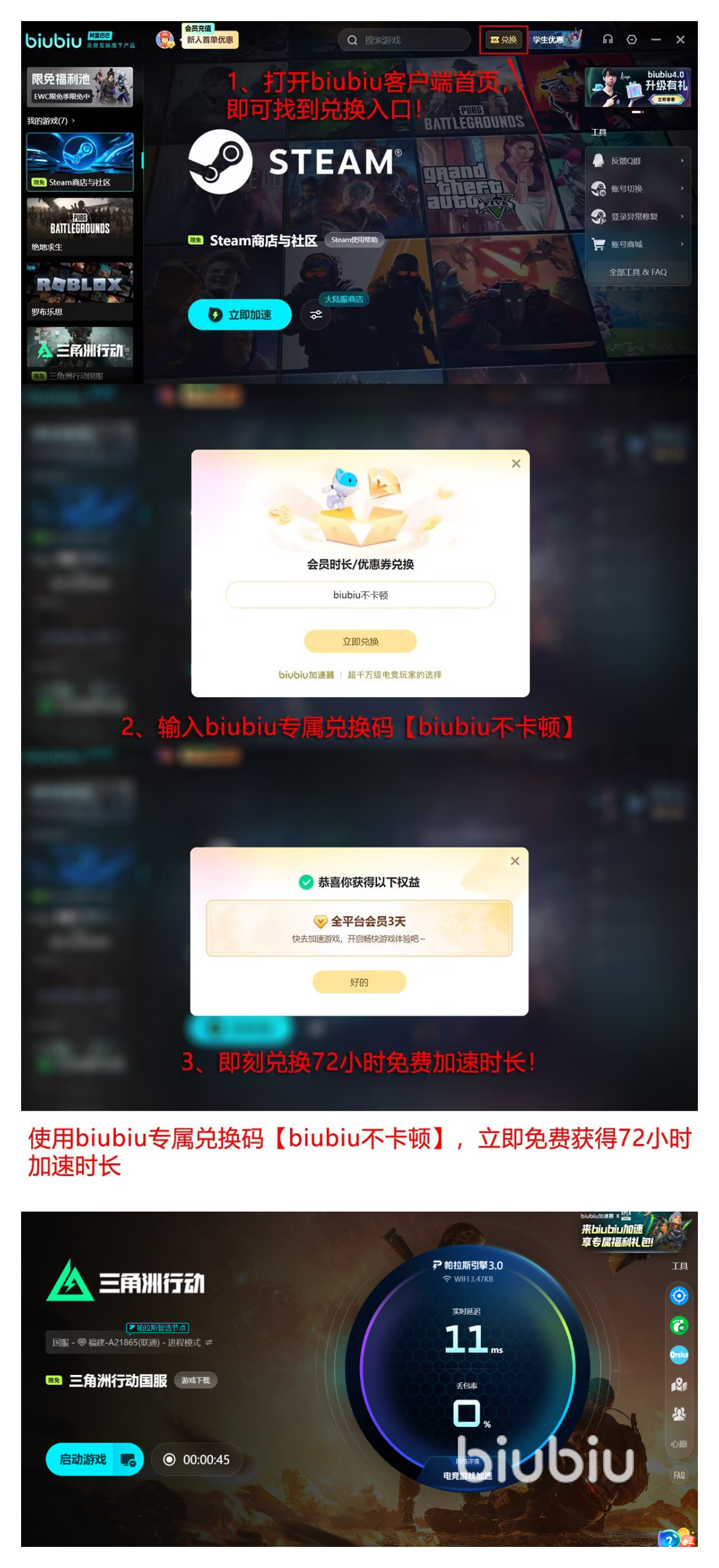 biubiu加速器除了重磅升级外,还为用户准备了很多活动。新用户只需要注册biubiu加速器,即可领取到一天的时长,同时不论是老用户还是新用户,只需要在biubiu中凭借兑换码【biubiu不卡顿】,即可兑换3天的免费时长。对于正在被对枪卡顿困扰的玩家来说,biubiu这波活动还是非常友好的,毕竟新用户只需要注册后便累计可以获得96小时的免费时长,大家赶紧来试试看!