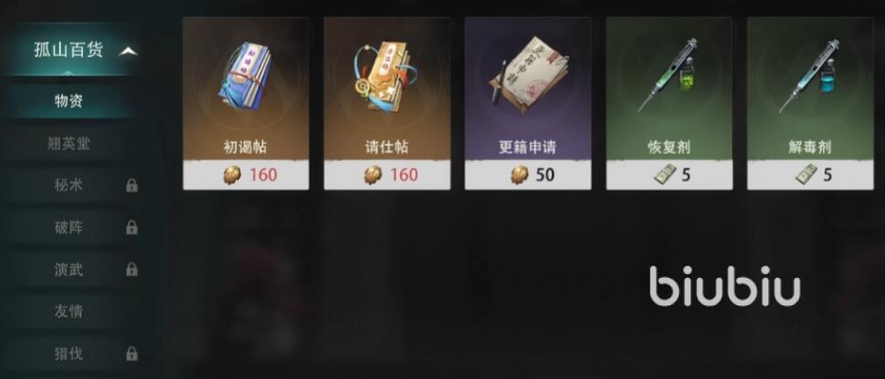 为提升操作效率,游戏在主界面功能栏中同步集成快捷入口:点击【商城】→选择【孤山百货】即可直连商店,无需手动跑图。该界面采用标准化分类逻辑,恢复剂、解毒剂、抗性药剂等高频消耗品均归入“基础补给”子类,便于玩家快速检索与批量采购。