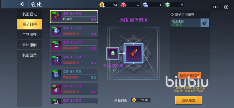 除基础强化外,强化界面还集成多项进阶功能:量子封锁、工艺调整、卡盘向前、效果重铸与装备继承。其中,“量子封锁”为强化的延伸形态,启用后可激活装备隐藏属性栏,解锁额外属性加成,但需消耗专属材料与金币;“工艺调整”则专用于优化晶体嵌套效果,调整后可提升装备整体工艺等级,间接增强属性转化效率。