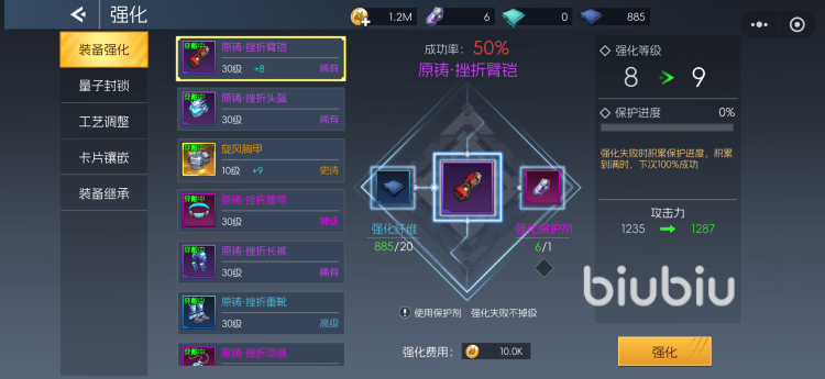 每次强化操作除消耗指定强化材料外,还需支付固定数额金币。若强化失败,已扣除的金币不予返还;但系统设有“保护进度条”机制——位于强化按钮右侧。该进度条会在每次失败后累积一定进度值,当进度条填满时,下一次强化必定成功,有效降低高等级阶段的不确定性。