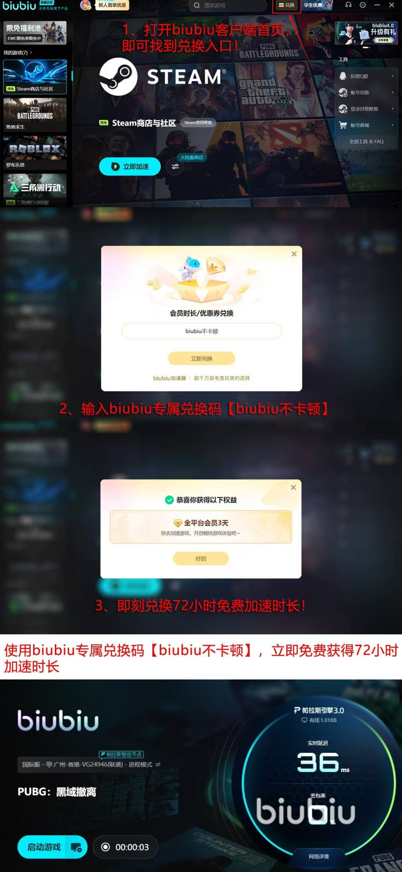 按照之前的游戏惯例,使用了biubiu加速器之后,大家在战斗过程中的帧率将会保持的非常稳定,鼠标和键盘的操作灵敏度大幅提高,延迟和卡顿的出现概率会很低。当然现在大家是有免费体验机会,只要注册就能立得24小时免费的新手福利,还有成功成为会员之后,还能参与会员口令领取72小时福利活动,只要复制 【biubiu不卡顿】口令在首页兑换就行,所以大家实际上能得到的是96小时。