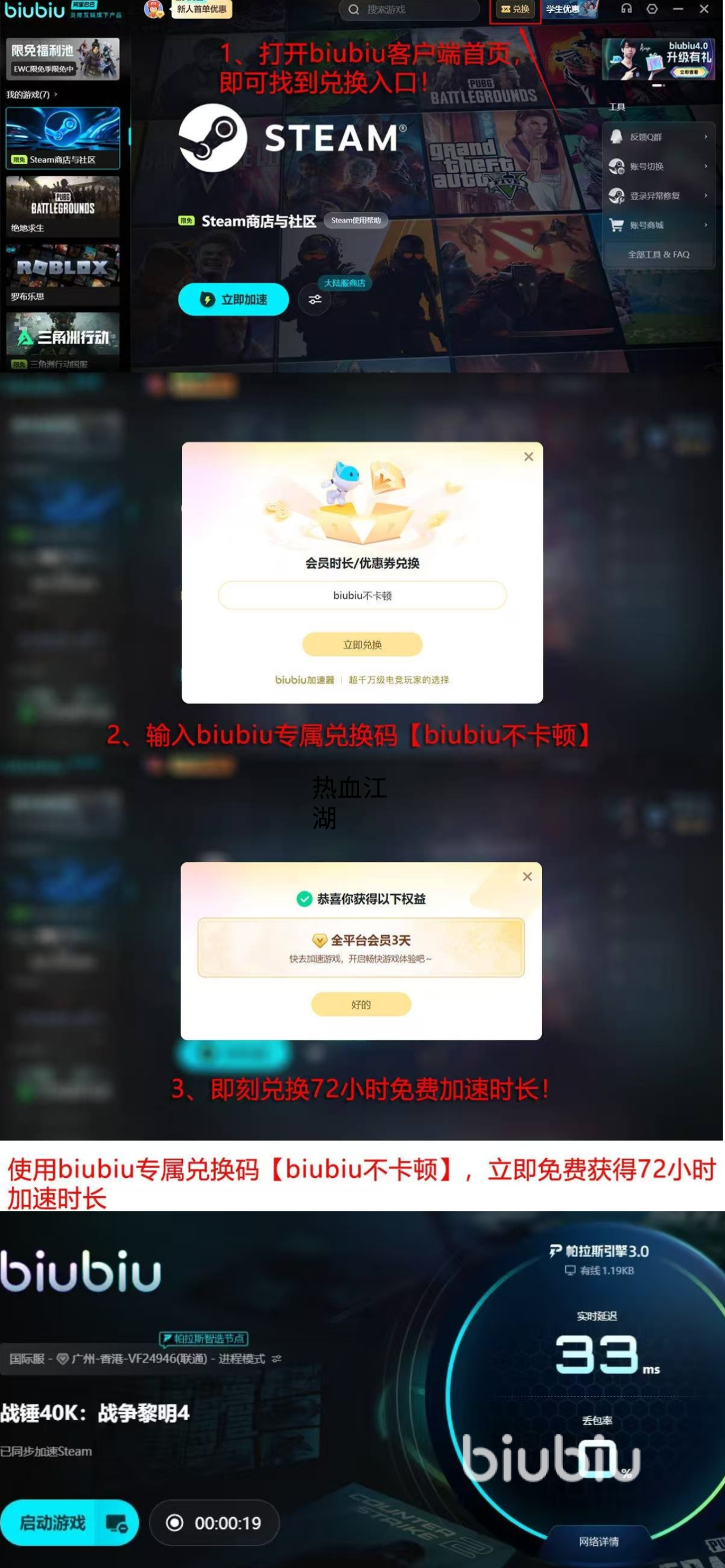 此外,新用户在初次登录这个平台时,可以得到一天提速体验,平台全体用户可以得到三天提速时长,不过这个福利大家需要用【biubiu不卡顿】在指定的区域内领取。