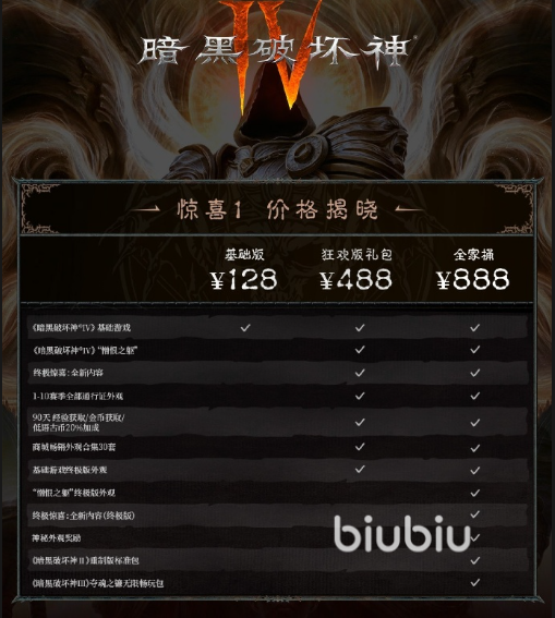 暗黑破坏神4国服将在2025年12月12日上线,推出基础版和狂欢版礼包两个版本。其中基础版售价128元,包含暗黑破坏神4完整的基础游戏内容,适合只想体验主线剧情和基本玩法的玩家;狂欢版礼包售价为488元,在基础版的基础上大幅提升,包含了憎恨之躯DLC、1-10赛季全部通行证外观、90天经验/金币/低语古币20%加成、30套商城热门外观以及基础游戏终极版外观,性价比非常高。全家桶版本售价888元是终极豪华选择,在狂欢版基础上增加憎恨之躯终极版外观、神秘外观奖励、暗黑破坏神2重制版标准包和暗黑破坏神3夺魂之镰无限畅玩包,是系列死忠粉的完美收藏。