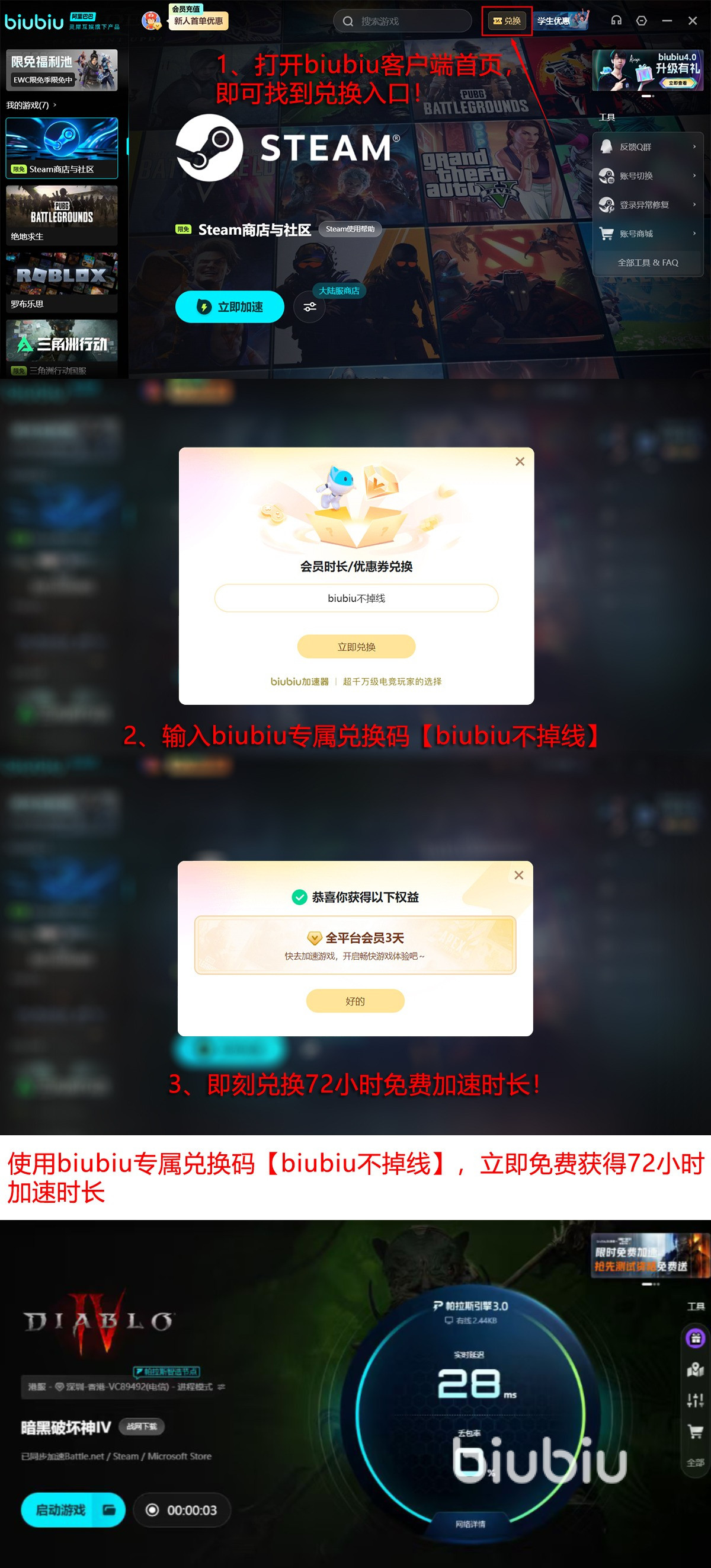 专享加速福利即刻领取,国服盛宴即将开启,biubiu加速器诚意奉上专属福利:新用户注册账号即可免费获取网络优化24小时,并且更有加码福利,输入专属口令【biubiu不掉线】继续享受无忧开荒72小时免费加速时长,双重新人福利叠加,总计96小时免费加速。