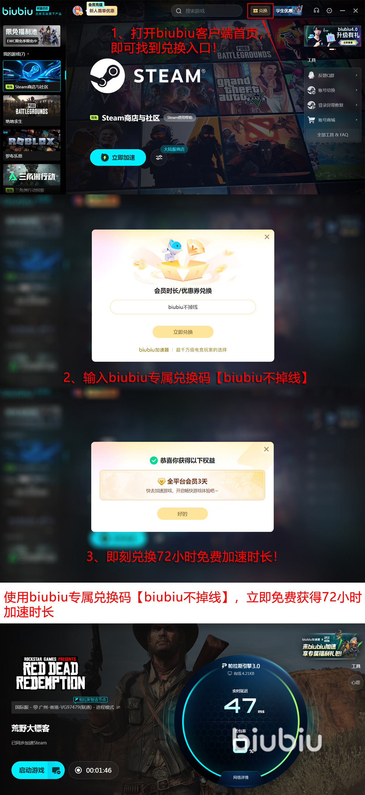 biubiu其实还给大家免费用的,不过需要一定的技巧,要知道密钥码是【biubiu不掉线】,这样就能换来72h的免费服务时间了,然后有注册优惠在,新用户是可以得到免费的24小时服务时间的,加一起新人可以用到的是96小时的。