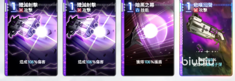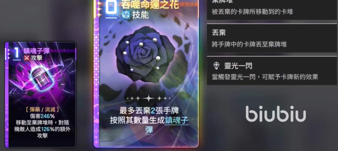 第二张卡牌的效果与手牌中子弹类卡数量挂钩,每多一张子弹卡,伤害提升50%;第三张卡在满足条件时可达成180%基础伤害。更为重要的是,这些卡牌在弃置后会触发额外效果——依据弃牌数量随机生成子弹卡,从而强化“灵光一闪”与子弹机制之间的协同关系。这种双轨驱动的设计,使黑玫瑰诗人在不同战斗阶段均能维持高强度输出稳定性。