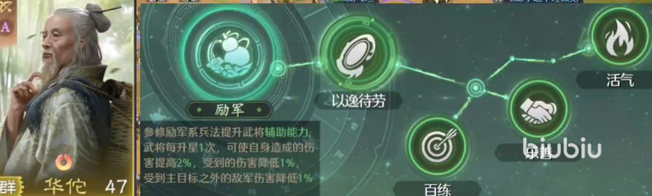 华佗承担队伍唯一治疗职能,其续航能力直接决定阵容持久作战上限。推荐技能组合为【天香】与【陷阵营】,前者提供即时群体回血,后者提升全队防御属性。若【陷阵营】尚未解锁,可选用【仁治武功】或【刮骨】替代;其中【后勤】虽治疗量稍逊,但仍可满足基础续航需求。在对抗高血量BOSS或精英怪时,充足治疗量是维持消耗战优势的关键前提。