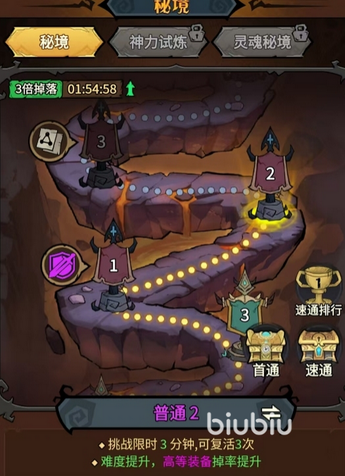 需特别注意疲劳值机制:每日仅提供2小时副本挑战时间。当剩余疲劳大于30分钟时,进入关卡将触发三倍掉落加成;剩余不足30分钟则恢复为基准掉落率;耗尽后无法开启任何副本。疲劳值每日凌晨5点重置。建议优先确保两小时高效利用,若仍有余力,可前往时空秘境参与不消耗疲劳的玩法,该区域同样提供可观资源奖励,属于不可忽视的日常补充渠道。