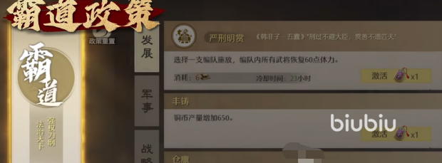 所有政策技能均需消耗虎符释放。虎符可通过沙盘地图探索民居随机获取,或在联盟商店兑换,后者成本较高,需合理规划使用节奏。政策等级随投入提升而增强,技能效果随之强化,建议根据当前发展阶段与战略重心分阶段升级。