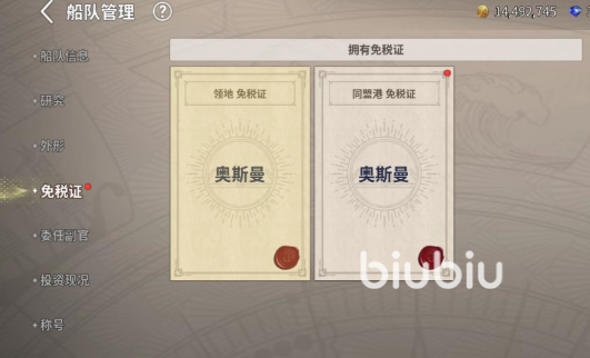 游戏中免税证分为两大类:领地免税证与同盟港免税证。领地免税证适用于单一国家全境——持有该证后,在目标国主城及其下属所有领地港口进行买卖,均可免除关税;适合专注深耕某国多港轮动贸易的玩家。同盟港免税证则限定于该国已缔结同盟关系的指定港口,仅在这些同盟港口交易时生效,更适合布局跨国联盟航线、频繁往来于多个主权国家之间的玩家。需特别注意:两类证件均设有明确有效期,到期自动失效,玩家须在截止前重新申请,否则将恢复全额征税。
