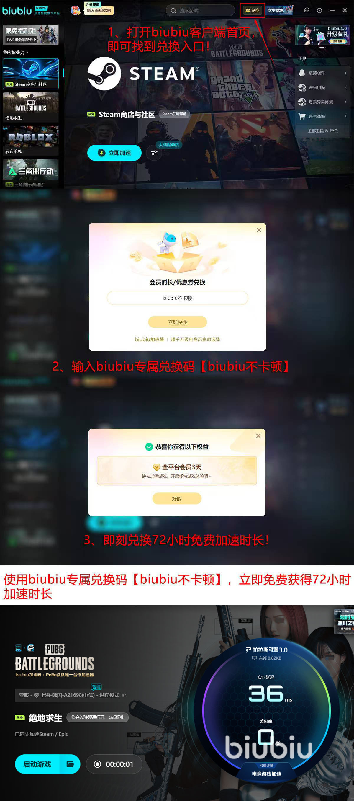 在biubiu加速器的加持下,大家在玩pubg的时候,游戏登录会更快,大大减少游戏延迟的情况,并且在各种场景之下,都能让游戏保持流畅,大家想要体验到这种情况,其实现在是可以免费体验的,只需要花上几秒钟时间,注册一个账号即可,注册完成后就能得到24小时免费时间,当然如果还不够,则可以使用会员身份,参加会员口令活动,使用【biubiu不卡顿】口令在客户端上领取到72小时福利,这些时间加起来一共有96小时,是可以叠加的哦!