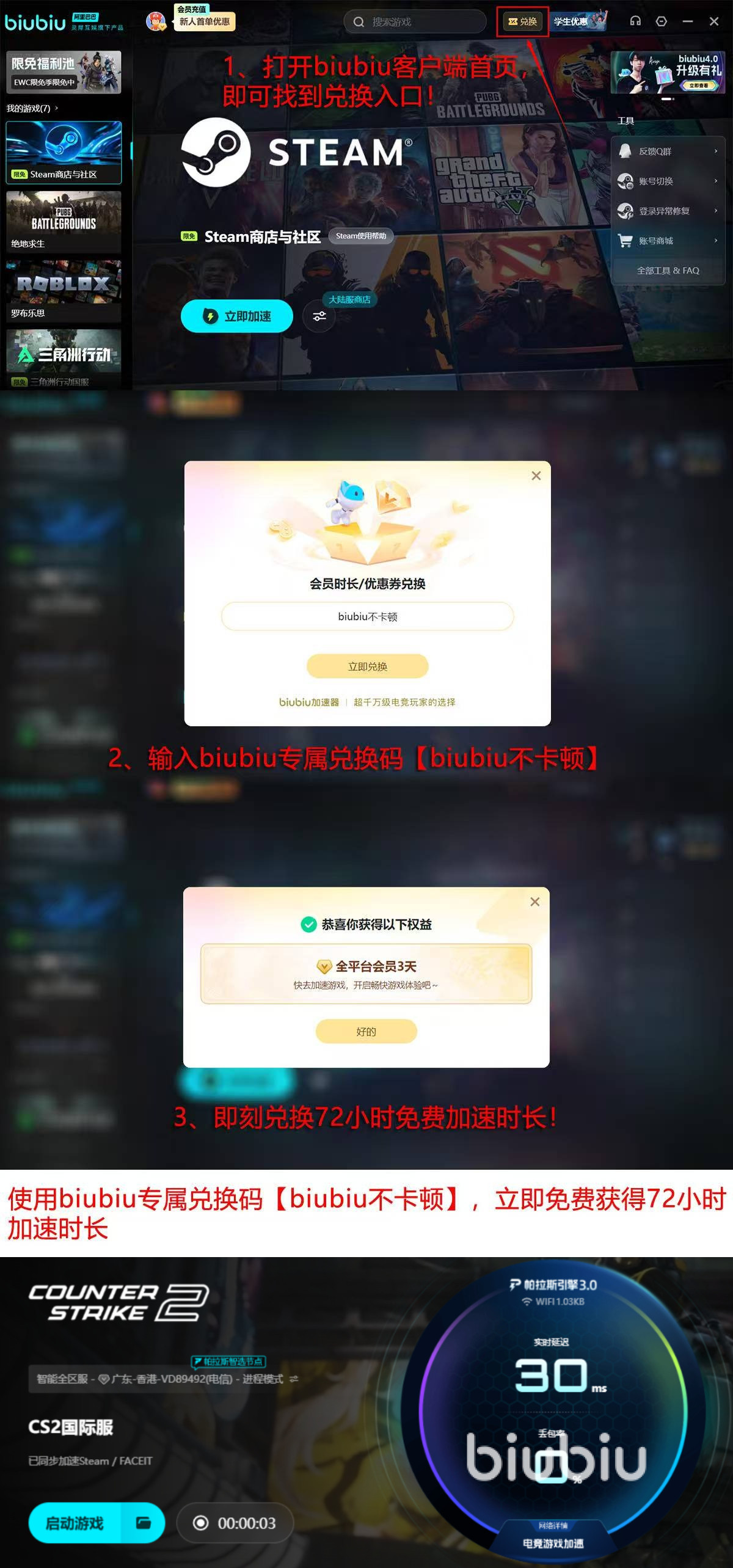 为了打消你的体验顾虑,新用户注册就送24小时的免费专属加速时长,并且还有福利口令【biubiu不卡顿】在客户端内输入之后可以继续畅享72小时稳定流畅的无虑体验,双重福利叠加新人可享受长达96小时的免费优质加速服务。