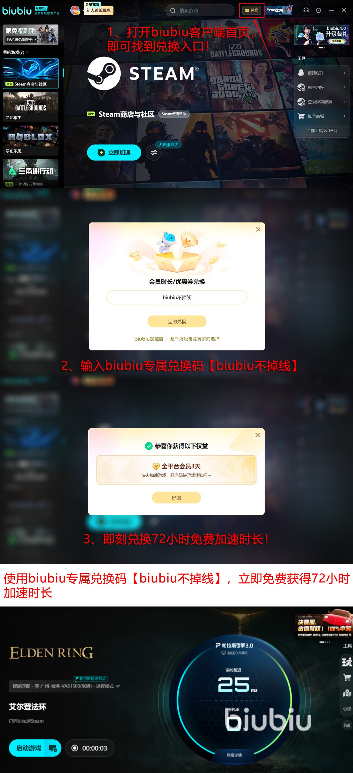 优劣亲测,biubiu对新用户很慷慨,专门赠送尊享24小时加速,输入口令【biubiu不卡顿】还能无负担享受72小时的稳定加速时长,新人累计福利达96小时,足够深入交界地探明各种网络状况。