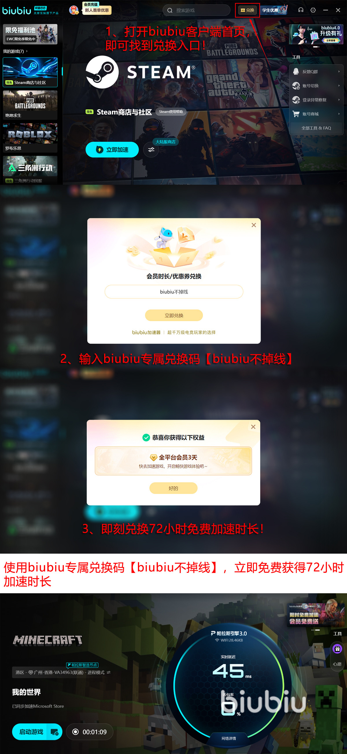 现在还提供为新用户量身定制的注册好礼24小时,完成注册流程并登录即可自动获取;【biubiu不掉线】这个密钥是全民可用的,使用后得到72小时的时长加持,如果两项一起获得就会累加到96小时了。