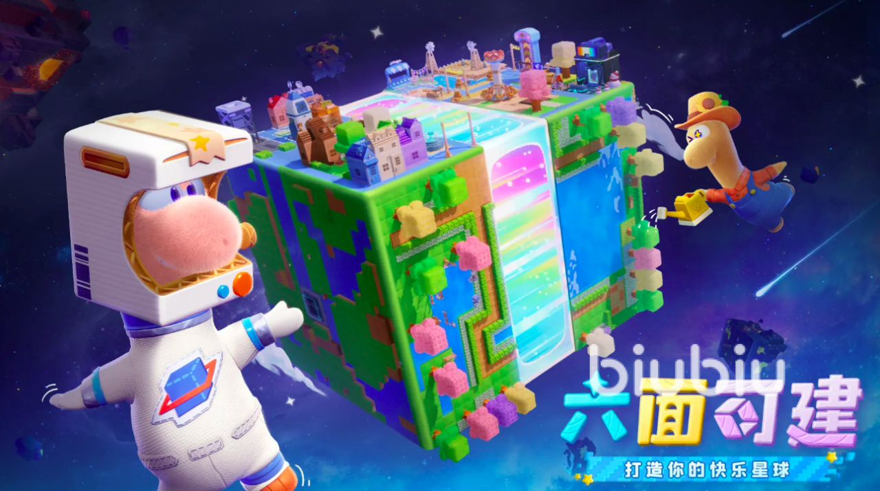 游戏核心机制之一是“六面体星球”建造系统。区别于常规平面沙盒逻辑,玩家可自主构建立方体形态的星球,并在六个独立面上进行差异化开发。根据实测PV展示,每一面分别对应不同季节主题——例如冬季雪场、春季花园区、夏季海滨度假区、秋季枫林营地等,支持温泉度假村、滑雪场等多种场景自由搭建。该系统赋予玩家高度的空间策略自由度与跨维度创作可能。