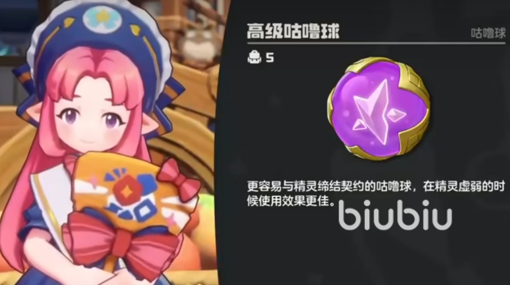 第二类为高级咕噜球,整体呈紫色,外圈环绕金色镶边,内部星形结构分化为双角状。该球需前往大世界商业街,与NPC安妮对话后使用独角兽叶仙兑换获得。其捕捉成功率显著优于普通球,对中阶及高阶精灵均具备良好适配性,在合理削弱目标血量后,单次投掷即有较高概率完成捕获。