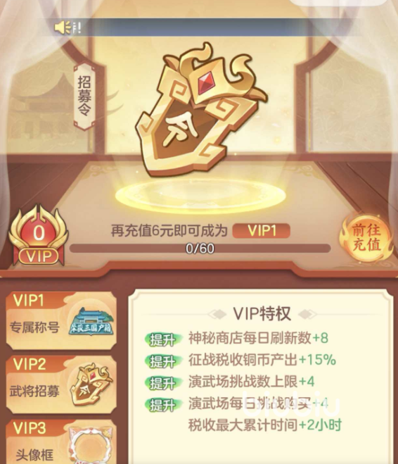 针对新手群体,《三国大冒险》还设置了专属成长路径:“新手登陆礼包”提供开局必备物资;“招募令充值”则支持6元提升VIP等级,解锁称号、增强每日铜币与经验产出,并开放更高阶名将招募权限,形成可持续的成长正向循环。