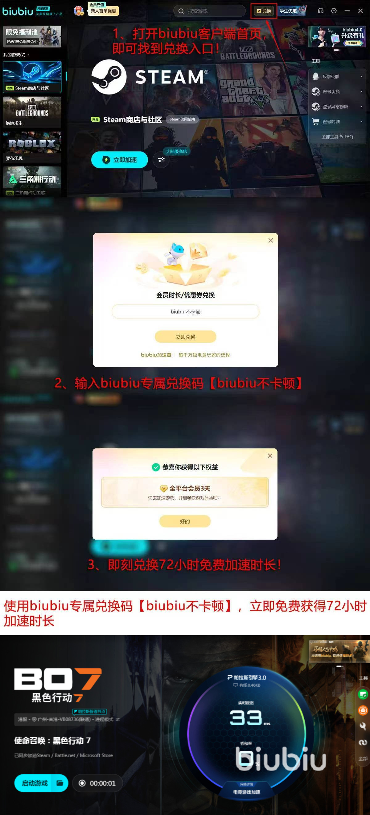 马上注册biubiu加速器账号,新用户就能获得战斗体验24小时免费加速时长,输入专属口令【biubiu不卡顿】这个大家拿去用可得到72小时的免费加速时间,两者叠加畅享总共96小时的顶级免费加速服务,助力你无阻称霸第一赛季战场。