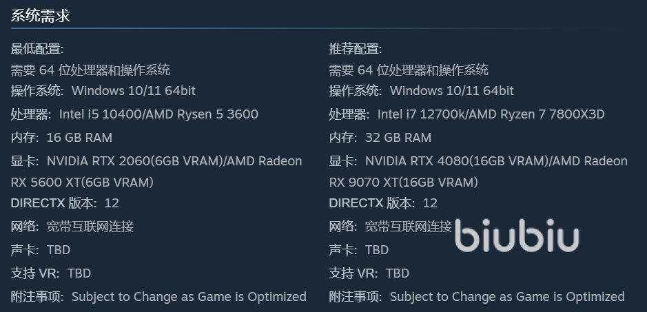 想顺畅驾驭引擎坠落的狂野世界,得满足设备的基础需求。操作系统要是Windows10或者11才行,这样才能保证系统顺利调用资源,Intel i5 10400是底线,在繁杂的物理模拟和场景加载下需要算力做支撑,而内存不能低于16GB以应付游戏众多的场景数据并高速切换,对于显卡要求则是NVIDIA RTX 2060(6GB),在1080P清晰度上实现流畅的画面显示,并且DirectX12是图形特效的关键。