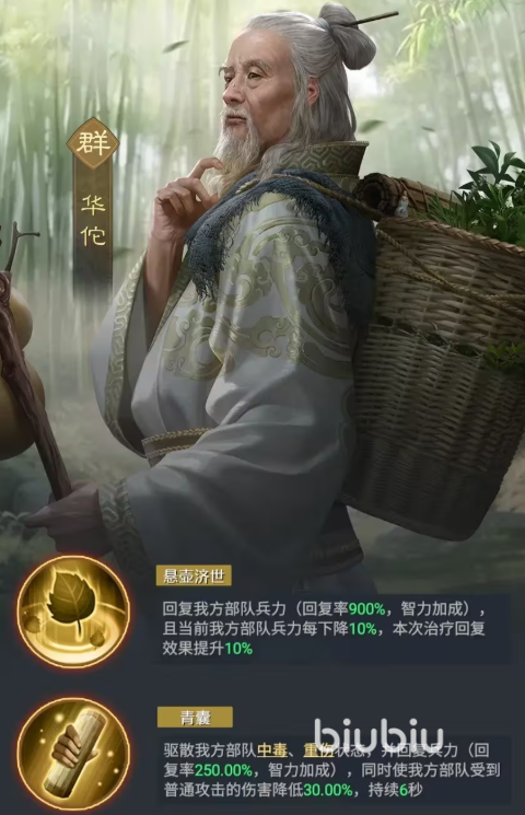 第二位是公认的单体治疗天花板——华佗。其主动技能可实现900%兵力恢复,且具备独特的“损失反馈”机制:每当己方单位兵力下降10%,即额外触发一次10%兵力恢复,显著提升残血单位的生存韧性。除高额治疗外,华佗还拥有强力驱散能力,可通过被动技能清除友方负面状态,在面对高控阵容时具有无可替代的反制价值。此外,他还能为受普攻目标提供30%减伤效果,与左慈等具备护盾或减伤叠加机制的武将配合,可构筑起极为稳固的前排防线。