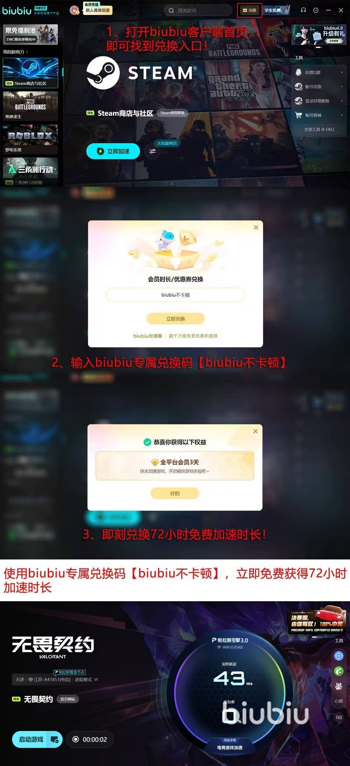 针对无畏契约专项开发的加速通道,可在整局对战中维持延迟数值平稳,大幅缓解突发性网络波动带来的操作中断问题。新用户注册后即可获得24小时全功能会员体验权限,全程零门槛、无隐藏扣费;所有用户输入口令【biubiu不卡顿】,还可额外领取3天免费加速时长。后台实时显示延迟、丢包、抖动等核心指标,支持手动节点筛选与一键优化,便于玩家自主掌握网络状态。