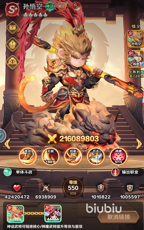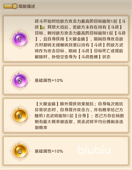 基础能力方面,孙悟空的普攻并非单纯伤害输出,而是具备战术削弱功能:每次命中敌方单体目标,均可降低其10%免伤效果,最多叠加10层,即最高削减100%免伤。该特性使其成为对抗携带减伤Buff或高基础免伤属性敌人的关键破防手。其怒气技能为单体高额伤害,并附带50%概率眩晕效果;当目标当前生命值低于50%时,该技能还将额外触发一次普攻,显著提升残血收割效率。