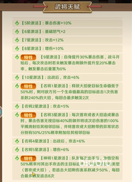 名将一星解锁的进阶天赋进一步拓展其战术价值:当大招将目标生命压至50%以下时,将自动锁定当前场上生命值最高的另一名敌人,追加一次伤害系数达240%的额外攻击,每回合最多触发2次。该机制使孙悟空兼具点杀与压制双重能力,在多目标战场中实现高效资源分配。