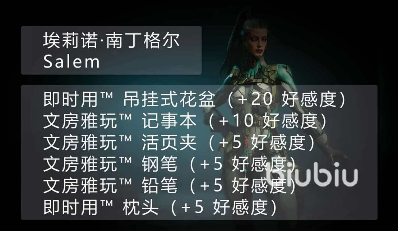 埃莉诺对家居装饰类物品反馈最为积极,其中吊挂花盆可提供最高20点好感度加成,是该角色的最优选择。其余文房类道具增益有限:记事本仅+10点,活页夹、钢笔、铅笔及普通枕头等日常用品均固定+5点。
