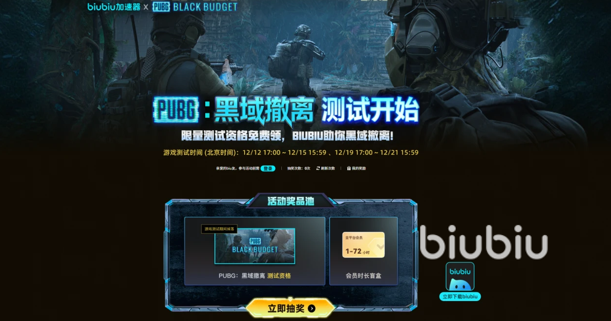 获取测试资格有两种主要方式:其一,前往Steam平台对应商品页面提交申请;其二,通过合作平台biubiu加速器参与每日任务活动,完成指定操作即可获得抽奖机会,奖池包含《PUBG:黑域撤离》封闭测试资格及随机时长加速服务。