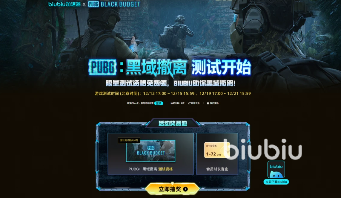 值得一提的是,PUBG活跃用户可通过biubiu加速器参与专属活动:完成指定加速任务后,即有机会抽取“黑域撤离”封闭测试资格,同时赢取随机时长的会员服务权益。