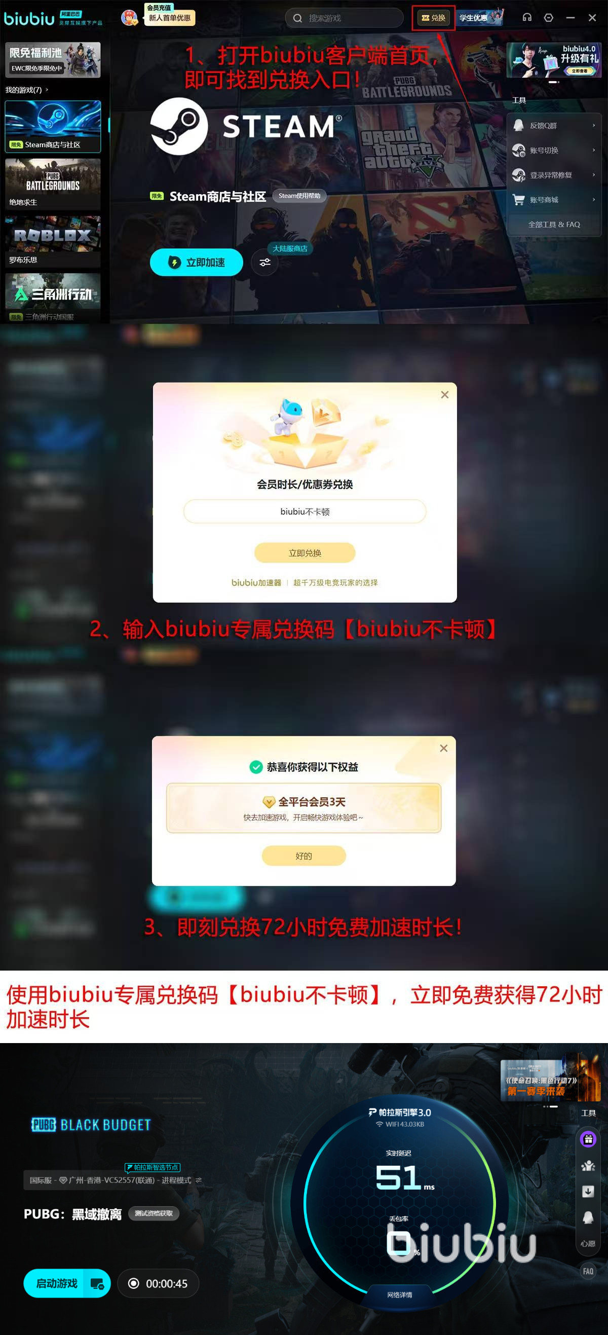 当前biubiu平台开放多项新手激励:每日完成基础加速任务即可参与抽奖,奖池包含限量测试资格与免加速时长卡;新用户注册即赠24小时无延迟稳定服务;在客户端输入专属口令【biubiu不卡顿】,还可额外兑换72小时电竞级加速权益。注册叠加口令后,总计可享96小时高品质网络保障。