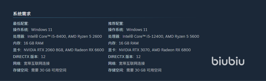 从硬件要求来看,《PUBG Black Budget》对显卡性能提出显著提升。官方明确标注:最低显卡需为NVIDIA GeForce RTX 2060,且显存容量不得低于8GB;该配置仅支持基础画质运行,全局光照、动态阴影、体积雾等UE5核心渲染特效将默认关闭。若要完整呈现次世代视觉效果,推荐配置为RTX 3070及以上型号。处理器方面,最低要求为Intel Core i5-8400,推荐配置为i5-12400——该型号已是第12代酷睿i5系列最高规格;为保障多线程任务调度稳定性,建议优先选择i7级别CPU。内存方面,16GB为不可妥协的起步标准,不建议使用单通道或低频DDR4内存。操作系统方面,游戏目前仅兼容Windows 11(22H2或更新版本),暂未适配Windows 10及更早系统。存储空间方面,安装包本体需预留至少30GB可用空间,不含后续更新与缓存数据。