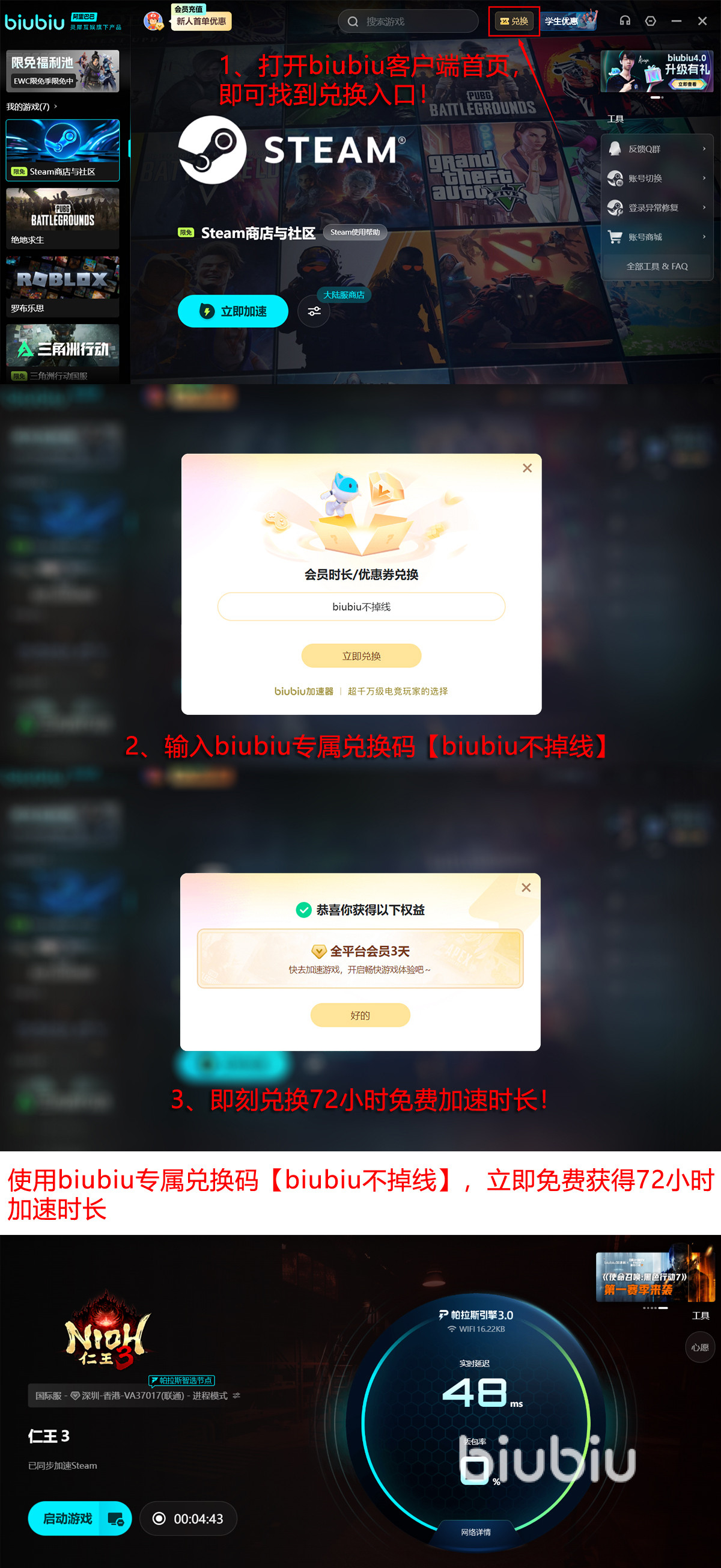 现在,只要用【biubiu不掉线】,就能直接领到72小时提速,第一次注册的新伙伴还能额外获得24小时特权。把这两样加起来,一共能免费96小时,足够你深入体验并参与未来的线上联机共斗了。