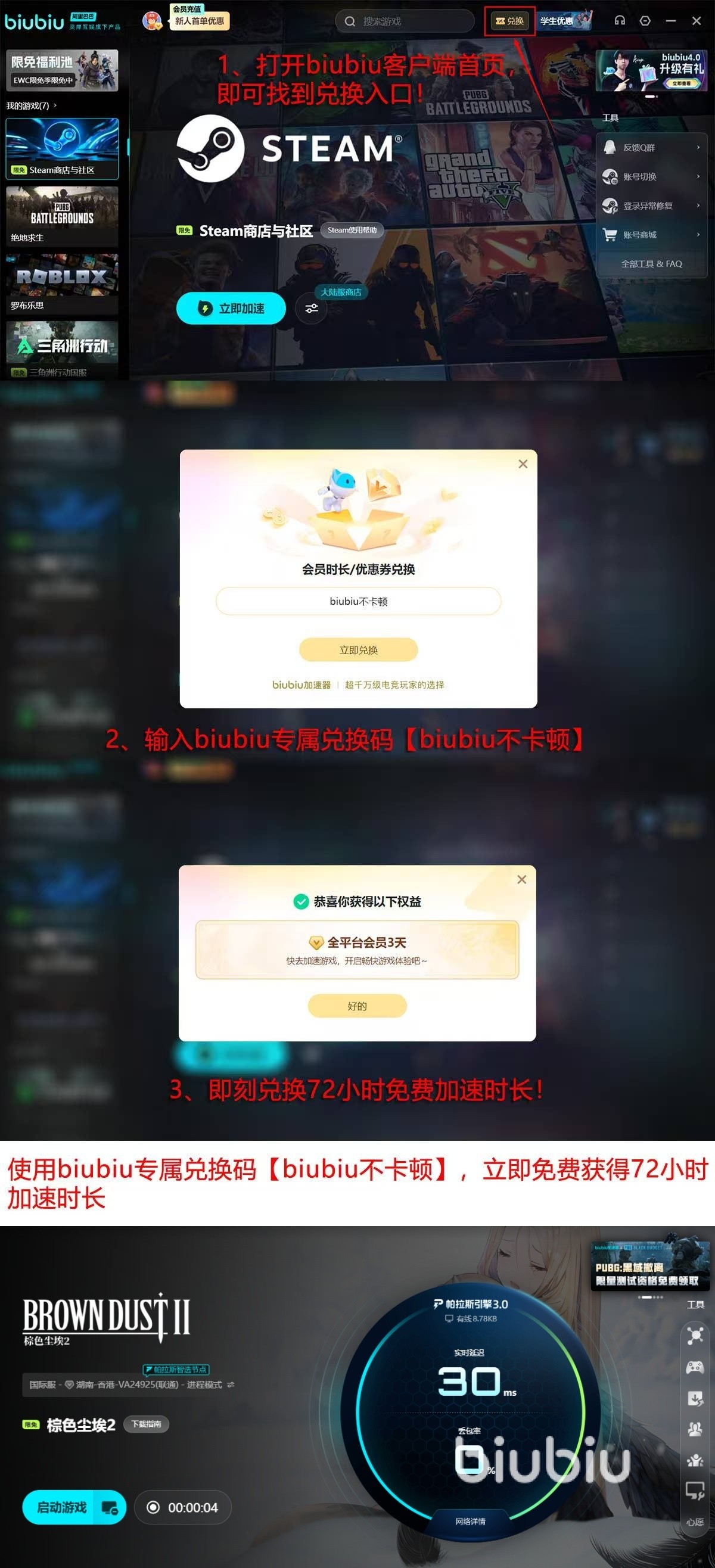 用户福利方面也是非常的给力,新注册用户首次登录就能解锁24H免费加速,给到大家一个试错的成本,而且所有平台用户均可通过兑换码【biubiu不卡顿】额外领取72H加速时长,叠加后新用户最高可获得96小时加速畅玩体验,这样一来,我们也就不用担心会有体验期间试用机会不足等尴尬的问题发生了。