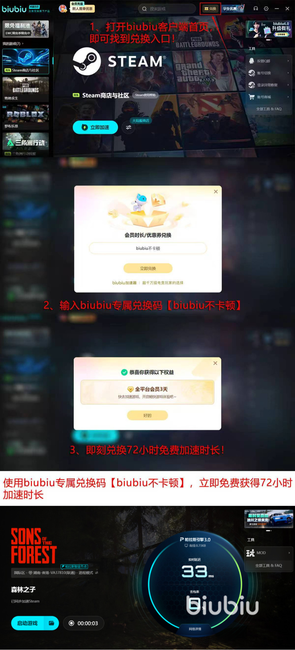 那种丝滑感真的会上瘾,之前跑图时突然黑屏闪退的噩梦彻底消失!想先试试?当然可以!因为平台给到了新人大福利,不用做任务就能直接领取24小时免费加速时长,想去体验什么游戏,随便去玩!要是觉得还不够,别着急还有,输入专属兑换码【biubiu不卡顿】,还能再得到72小时免费加速。这么算下来可是有4天时长哦,体验过后包你心动,将会让你爱上这种特别丝滑的游戏快感。