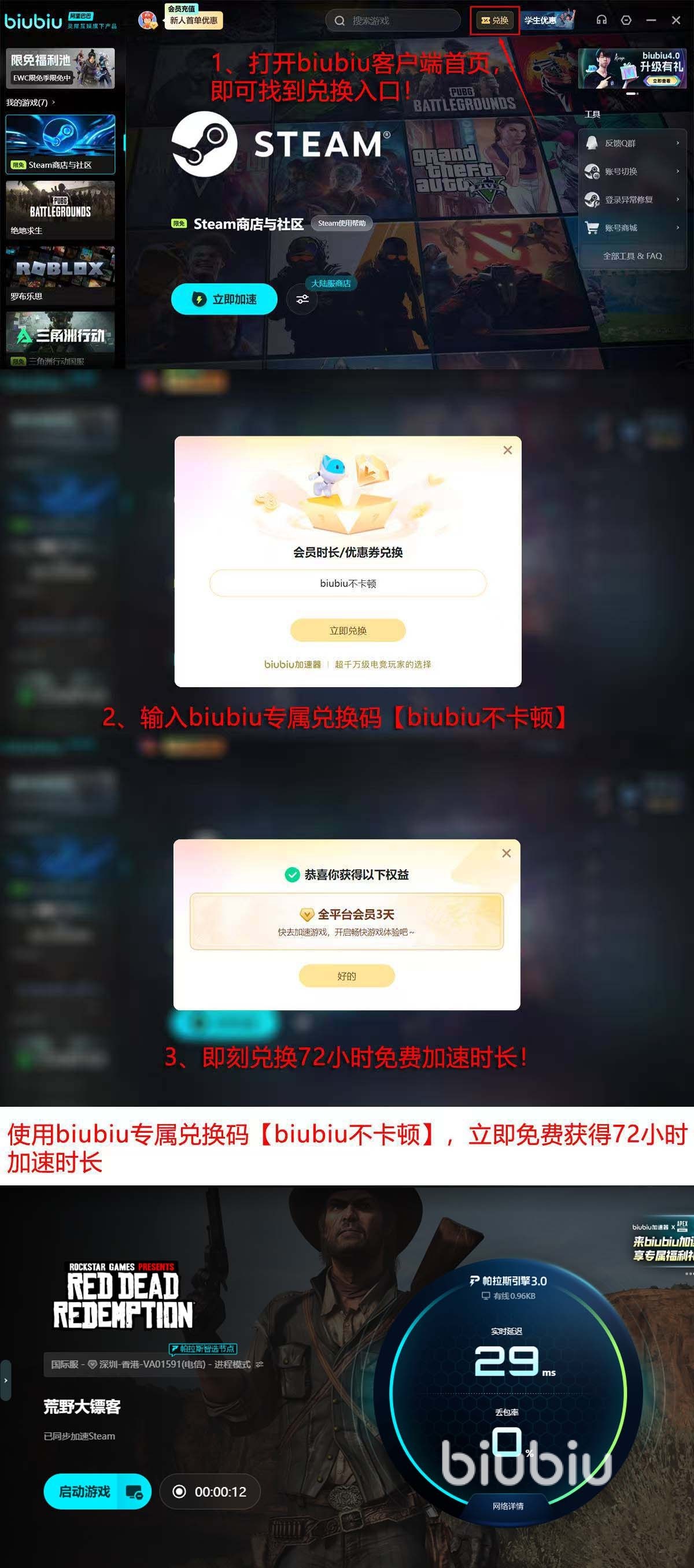 biubiu的将游戏网络加速后,在荒野大镖运行期间,无论是骑马战斗,还是捕捉野马等动作,都会变得轻松不少,而且这种轻松的感觉,现在还有4天时间能免费体验,只需花10多秒注册一个biubiu账号,登录就立刻获得24小时免费时长,然后在客户端上,用【biubiu不卡顿】口令还能直接兑换到72小时福利,这个4天时间就是通过两个活动累积的96小时。