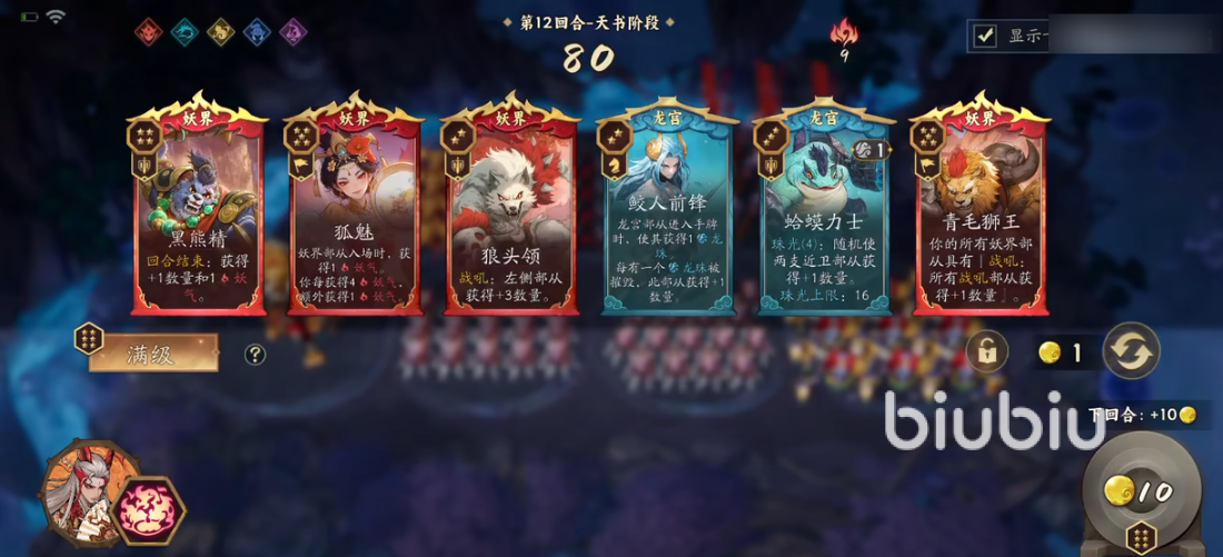 战局推进至后期,需同步强化输出与经济双线能力。关键卡牌包括【雷鸟怪】(提升全队攻击强度,数量越多增益越显著)、【羽翼天魔】(妖族专属金币产出核心,直接决定升级速度与卡牌刷新效率)、以及组合技型卡牌【金翅大鹏】与【九尾天狐】——前者放大金币消耗倍率,后者提升消费转化收益,并额外提供助战加成,二者联动可最大化金币流运转效能。