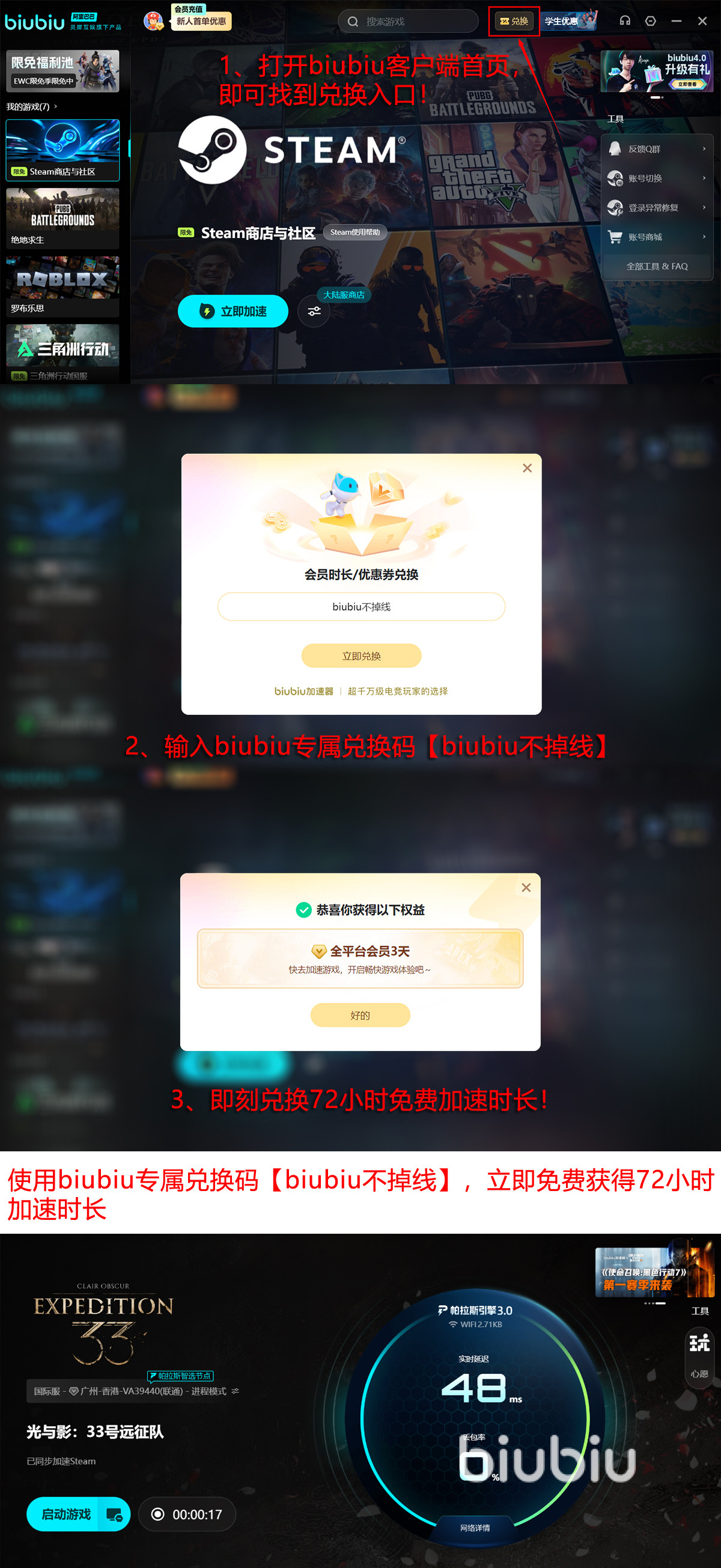 活动期间(12月12日至12月25日),biubiu加速器面向《光与影:33号远征队》提供站内限免加速服务。新用户注册即可领取新手礼包,并享有24小时基础免费加速时长;输入密钥【biubiu不掉线】,还可额外激活72小时专属服务权限,累计可获96小时加速使用权,名额有限,建议及时申领。