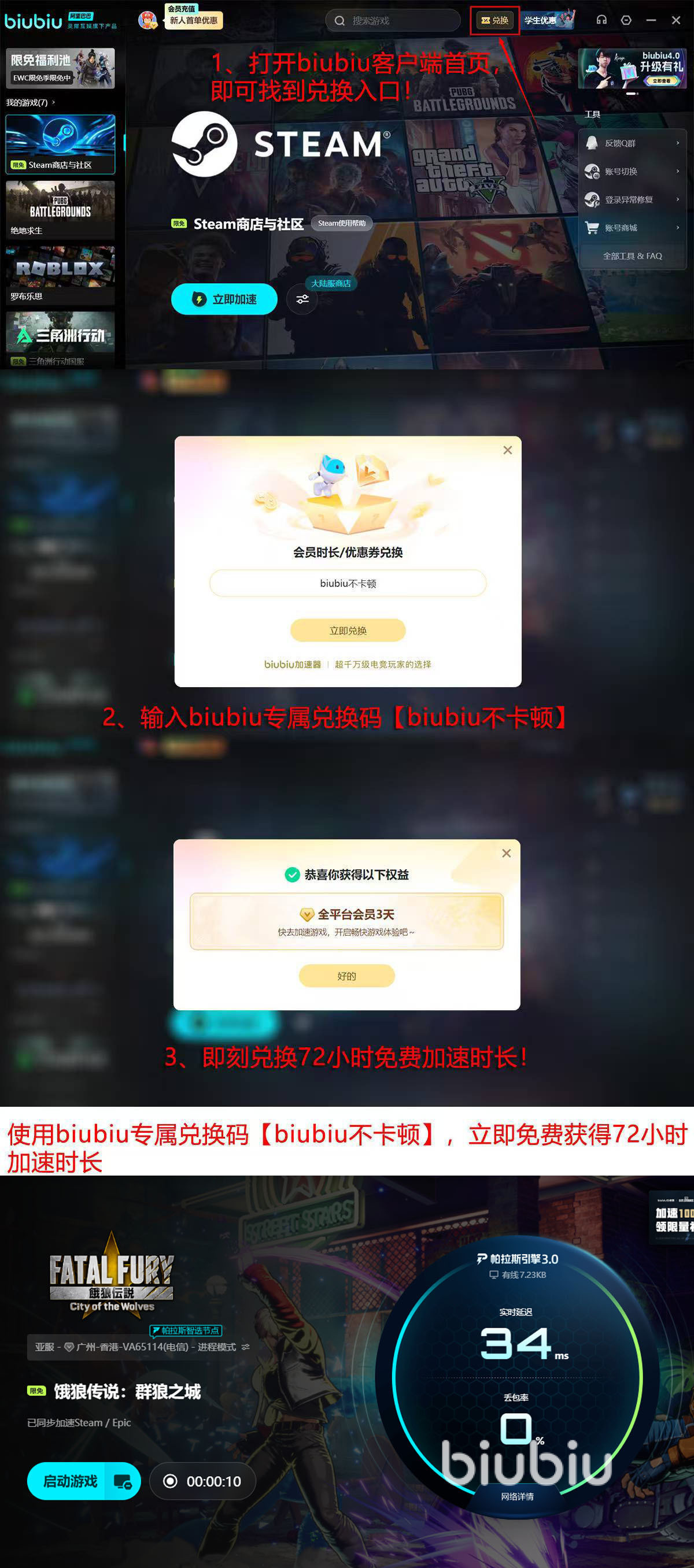 作为格斗游戏,对于键盘的响应速度,操控灵敏度要求格外高,当大家使用了biubiu加速器之后,玩网络游戏也能享受到街机的感觉,如果大家想要体验,现在注册账号就送24小时免费体验时间,如果还不够,参加会员口令兑换72小时活动,只需用【biubiu不卡顿】兑换码在首页兑换即可,一个新账号总计能领到96小时。