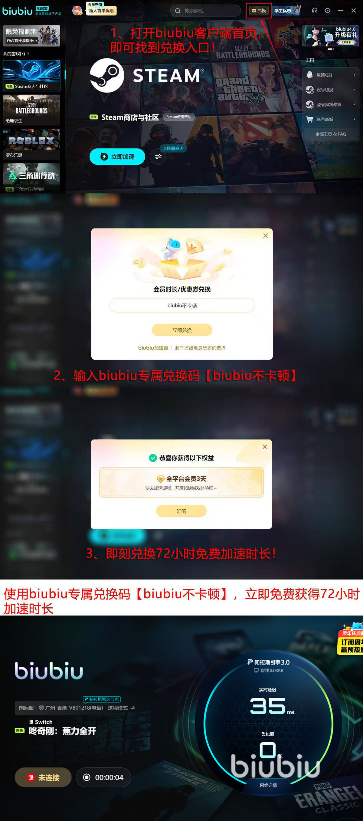 在通过加速支持之后,大家在玩游戏的时候,动作会更流畅,画面的跳转卡顿现象将大幅减少等,游戏将获得持续的网络支持。大家如果想要获得这样效果,可以安装一个biubiu加速器,注册后就能有免费加速时间领取,注册成功可直接得到24小时,之后参与会员口令兑换活动,通过在客户端首页使用【biubiu不卡顿】口令,可兑换到72小时,这样大家就能得到96小时免费加速时长。