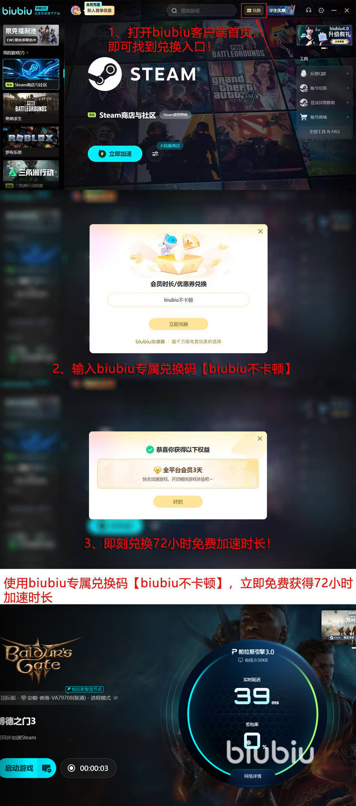 经过biubiu的提速之后,大家所获的游戏网络会变的稳定,各种游戏操作,以及战斗时流畅度也就得到了保障,现在大家还能无成本体验这些效果,且最多有4天时间,只需注册一个新账号,就能有24小时,成为会员就能参与仅一次机会的口令兑换活动,用【biubiu不卡顿】口令在首页上兑换到72小时 ,对于新人来说,一次就能得到96小时的免费加速时长。