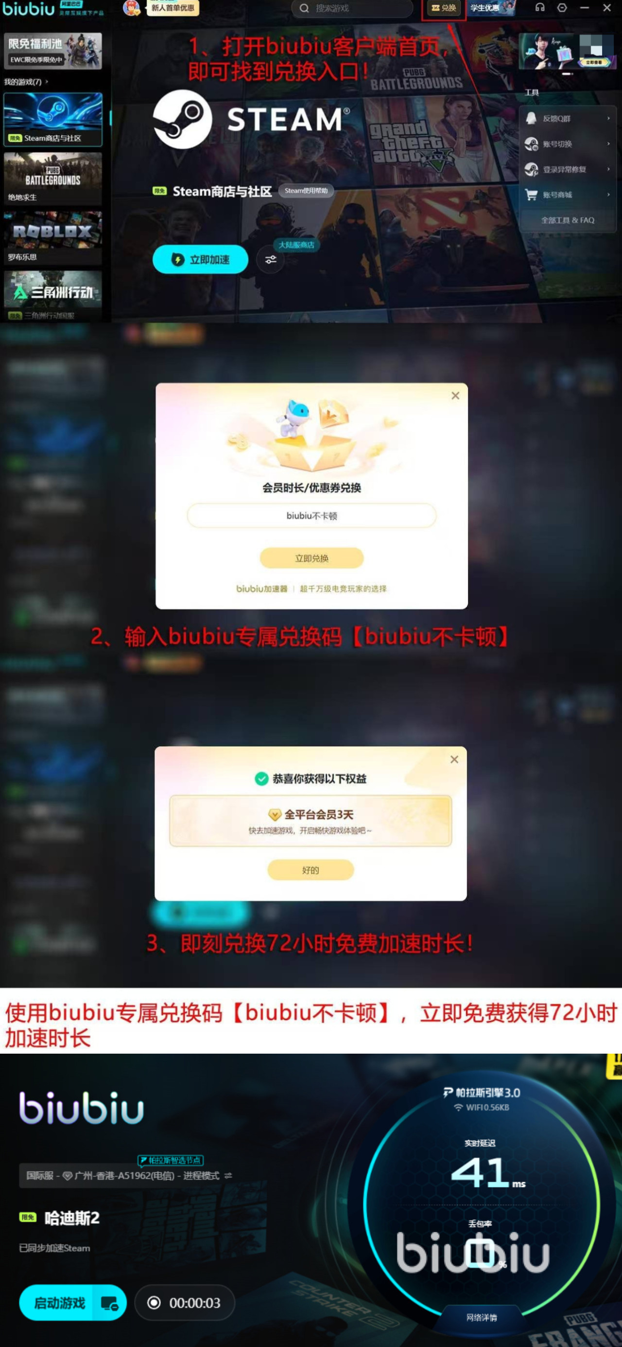 新用户使用该应用还可以得到不少好处,比如初次登陆拥有24小时体验福利,直接发放,无需大家领取。若是小伙伴们觉得体验的时间不够,那么平台还额外给大家带来了三天的提速时长,大家只需要根据正确的口令码【biubiu不卡顿】在指定的兑换区域领取即可。