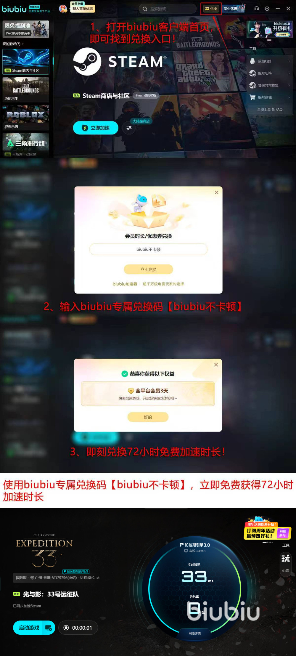 开启biubiu后玩游戏的改变,说是脱胎换骨都不夸张!之前在遗忘战场探索,每走几步就加载转圈,美丽的场景全被割裂;现在全程丝滑加载,能沉浸式欣赏那些超现实主义的奇幻景观啦。重点是首次注册直接送24小时免费加速,相当于全天不限时畅玩。而且现阶段还有一重福利,再继续输入专属兑换码【biubiu不卡顿】,还能再次拿到72小时的免费时长,也就是新人能累积拿到4天的免费享受时长呢,不来薅真的亏大了。