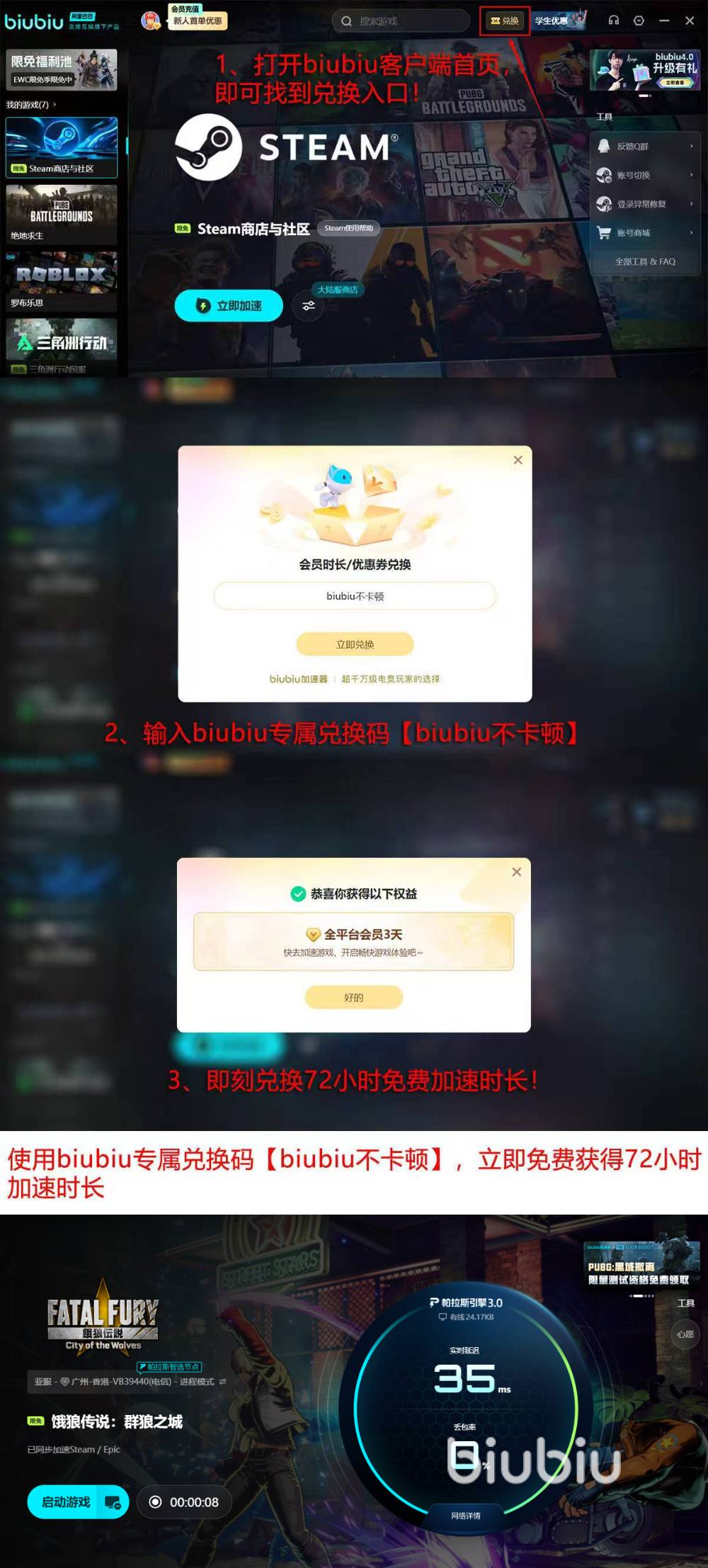 biubiu对新人超大方,福利直接拉满!首次注册的小伙伴,下载软件完成登录后,24小时免费加速时长直接到账,不玩什么套路!这还不够,目前输入专属兑换码【biubiu不卡顿】,还能额外获取到72小时免费加速的时间呢。这可是长达4天的体验时间,足够各位伙伴去体验各个游戏的加速效果了,之前总被卡到心态爆炸,现在连招不断,连胜率都悄悄涨了不少。